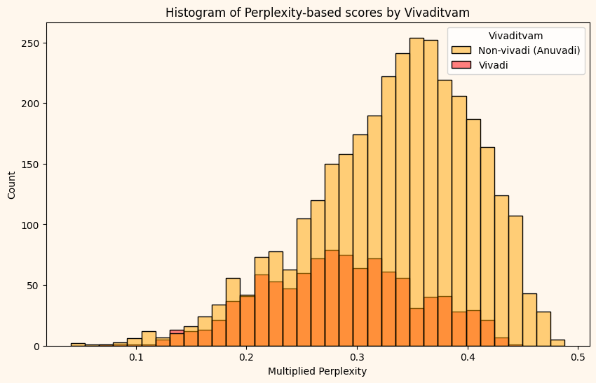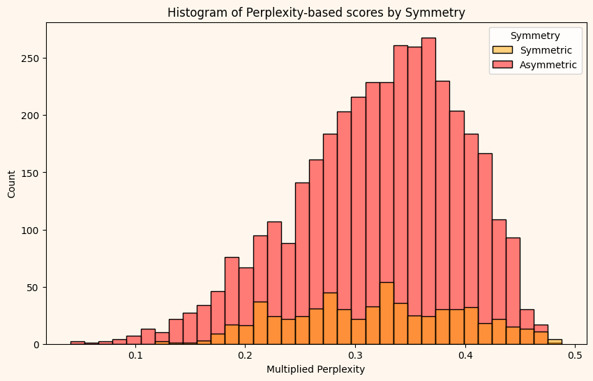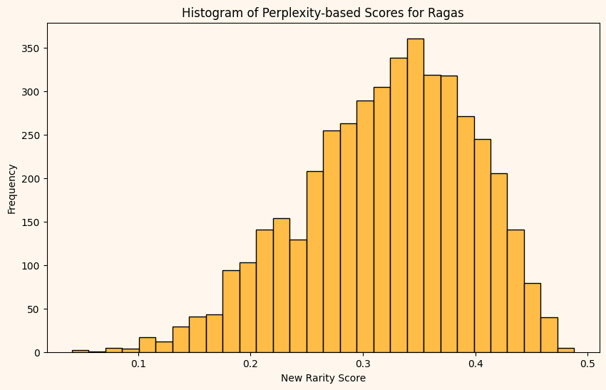 I plot a histogram of our perplexity-based rarity. Neatly distributed. I have been scouring the data endlessly to explain that sudden drop between 0.2 and 0.3, but no success as of yet.
